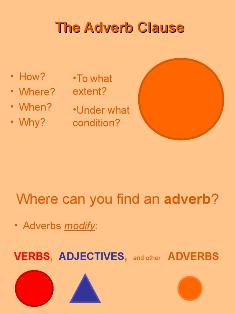 adverbs of manner.doc from imgv2-1-f.scribdassets.com An adverb is a word that modifies (gives us more information about) a verb in a sentence. The rain fell heavily. when my teacher speaks, we listen carefully. make sure you write neatly. An adverbial clause is a group of words that functions as an adverb and that contains a subject and a verb. Adverbs are expressions that function as modifiers of other elements in the clause. Just like some examples of adverbial clauses of manner: I slowly began to feel. Here is an easy example of an adverbial clause: There are many different types: